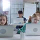Young male teacher standing and monitoring students’ progress while they are doing task on laptop computers in information technology class
