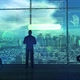 Male silhouette in the office working with code projected in front of him in the air.