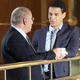 Two men talking in business centre hall, senior one having coffee