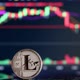 Coin Litecoin LTC on background cryptocurrency trading chart on computer screen. Digital money, banking, investment, finance and business concept.