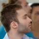 Tilt up of unshaven young man copying data from visual device to whiteboard