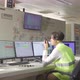 Expert engineer talking to Radio and looking at computers.