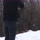 Human posture controlling drone from bottom up in front of the snowy wheater landscapes ,video about man standing in front of snowy forest controlling drone and flying it