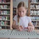 Emotional school girl looking at camera like at computer screen while typing on keyboard