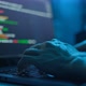 Hacker is working on laptop at night. Hands are typing a virus code at keyboard or hacking website.