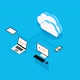 Animation showing the concept of cloud storage or computing. Different devices: tablet, notebook, PC and smartphone receiving data from the cloud. Bright blue technology background. 4k