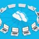 Simple animation showing the idea of cloud computing by linked together group of notebooks. Laptops in a circle receiving data from the cloud. Bright blue technology and network background. 4k