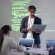 Medium shot of three mixed race high-school pupils typing on laptops listening to information technologies teacher with laptop in hands explaining lesson topic checking students screens