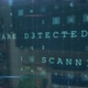 Animation of close up of computer server room hardware while glowing digital text about computer security flashes and moves in the foreground
