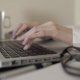 Woman open and typing text on laptop at office. Full HD 25 fps 0:14 Sec.