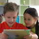 Close up of two kids having fun with digital device, two of their classmates in the background