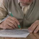 Concentrated retired man solving logic test at table, memory exercise, neurology