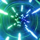 Fly through technology cyberspace with neon glow. Sci-fi flight through hi-tech technology tunnel. Hologram and neon light. 3d looped seamless 4k bright background. Data flow. Shallow depth of field