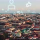 Concept of social networks and digital communications in the city. Flight over the city with a wireless network connection with social media icons and smiles.