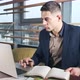 Concerned man working on laptop computer and looking away thinking solving problem at office. Serious athletic male working with notebook.