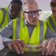 Confident team of architect working together in office looking at computer screen. Multiethnic civil engineers in reflective vest develop project on computer in office