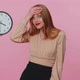 Confused young woman with anxiety checking time on clock, running late to work, being in delay, deadline on pink studio background. Serious girl looking at hour and minutes, worrying to be punctual