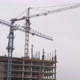 Timelapse Construction the buildings. Construction Process of Skyscraper with cranes on the roof. Weather with snow and rain