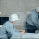 Developer and contractor in helmets discussing architecture project in the office