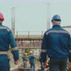 A Construction Site Workers with safety hard hats are walking through the commercial site. Camera following them from back.