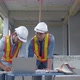 Young Asian engineers and caucasian engineer colleagues at site inspector and discuss together using notebook computer and paper blueprint at building construction site.home renovation ideas concept