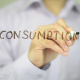 Man, Businessman, entrepreneur, stock trader, analyst or banker writes on transparent wall : Consumption