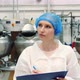 Controller checking confection factory. Young female in uniform making notes in folder while inspecting laboratory in confection factory. Candy factory.