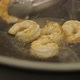 Cooking. Prawns In Pan Fried In Oil. Healthy Eating. Cook Turns Shrimp With Metal Tongs In Different Directions.