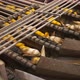 corn seed production. close-up. Corn processing factory. Freshly harvested corn cobs are moving on automated conveyor belt of modern maize plant. Agribusiness.