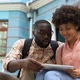 Couple using travel guide application tablet, educational program for students