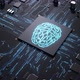 Central processor on a printed circuit board. sign on the brain chip as an electronic circuit . dynamic 3d animation . concept of technology and computer science
