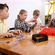 Motion of happy boys and girls creating robot, chatting and having positive emotions and joy. Science engineering. Young friends working on project. Building kit for group of four kids.