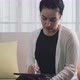 Woman sits on the sofa at home, draws,writes and uses a pen with a digital tablet computer.Creative process.Manifestation of bright,cheerful energy as a creator,creator of something new, professional