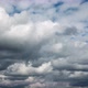Time lapse sunbeams break through grey cumulus clouds in sky. Cumulus cloud cloudscape timelapse. Weather change from stormy clouds to white fluffy clouds in clear blue sky. Skyscape background