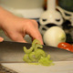 This is footage of celery getting sliced and cut into pieces with a stainless steel knife.