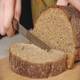 Woman Cuts Off A Piece Of Rye Bread With Knife On The Wooden Cutting Board. Closeup.
