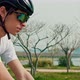 Athletic sportswoman in cycling sportswear and black helmet cycling on bike along bicycle lane path. Professional man cyclist training outdoors, doing endurance workout and cardio exercises.