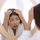Dandruff problem. Young emotional woman wearing bathrobe looking at mirror and examining her dirty hair with horror, feeling terrified because of scurf, slow motion