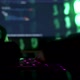 Closeup male hands in gloves is hacking password. Programmer software developer is typing malware on laptop keyboard to steal data. Binary code appears from projector light. Hacker attack concept.