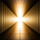 Camera moves through dark long bank vault room with safety deposit boxes and light at the end, infinite seamless loop