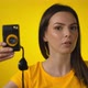 A young dark-haired woman is using a retro camera for shooting a selfie in a mirror in a yellow background studio