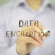 Man, Businessman, entrepreneur, freelancer, software engineer, programmer writes on transparent wall : Data Encryption