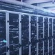 Animation of data processing and digital information flowing through network of computer servers in a server room with white light trails flashing on surface. Global network of internet service provider or data processing centre concept.