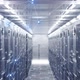 Animation of data processing and digital information flowing through network of computer servers in a server room with blue light trails flashing on surface. Global network of internet service provider or data processing centre concept.