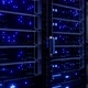Modern interior server room data center. Connection and cyber network in dark servers. Backup, mining, hosting, mainframe, farm, cloud and computer rack with storage information. 4K UHD 3d animation
