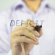 Man, Businessman, entrepreneur, stock trader, analyst or banker writes on transparent wall : Deficit
