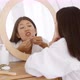 Dermatology problem. Young unhappy asian lady squeezing pimples on her chin, looking at mirror in bathroom, over shoulder view, slow motion