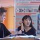 design university students brainstorming blueprint in open space. irrl coworkers discuss work pointing at drawing on desk. collaborate with architect colleague. stand whiteboard background