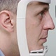 Closeup tracking of mid adult grey-haired man having modern eye refraction test during routine eye examination