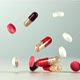 Different types of pills fall on the table. On a white background.Filmed on a high-speed camera at 1000 fps.